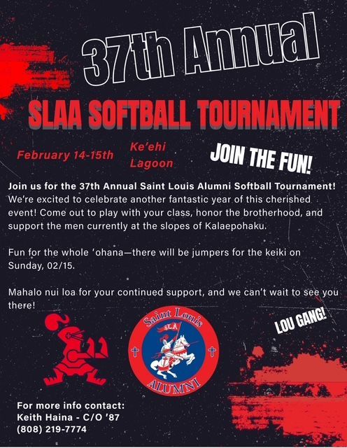The 37th Annual SLAA Softball Tournament will be held on February 14-15, 2026 at Ke'ehi Lagoon. SLAA is proud continue continue this longstanding tradition as we gather, fellowship, and take part in this friendly competition while we remember those who have been instrumental and made a great impact in this event. Interested participants can contact Keith Haina '87 at (808) 219-7774. An orientation meeting will be heald at the SLAA Clubhouse on Wednesday, January 28 at 7pm. Please come out and join in on the fun!!!