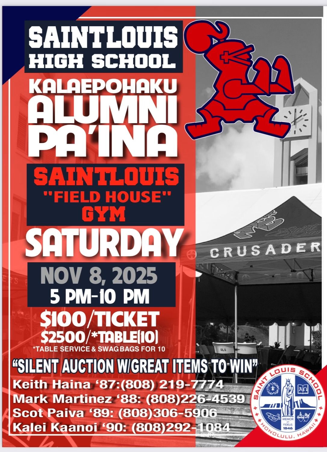 RSVP by Friday, October 10, 2025 with shirt size (classmates only) and payment ($80 per classmate/$20 per spouse or significant other). For payment options, you can Venmo me @VernonEric-Young (8083482613), Zelle (crusad8r@yahoo.com) or send check made out to Saint Louis Class of 80 to Shawn Santos, PO Box 1377, Kailua 96734.